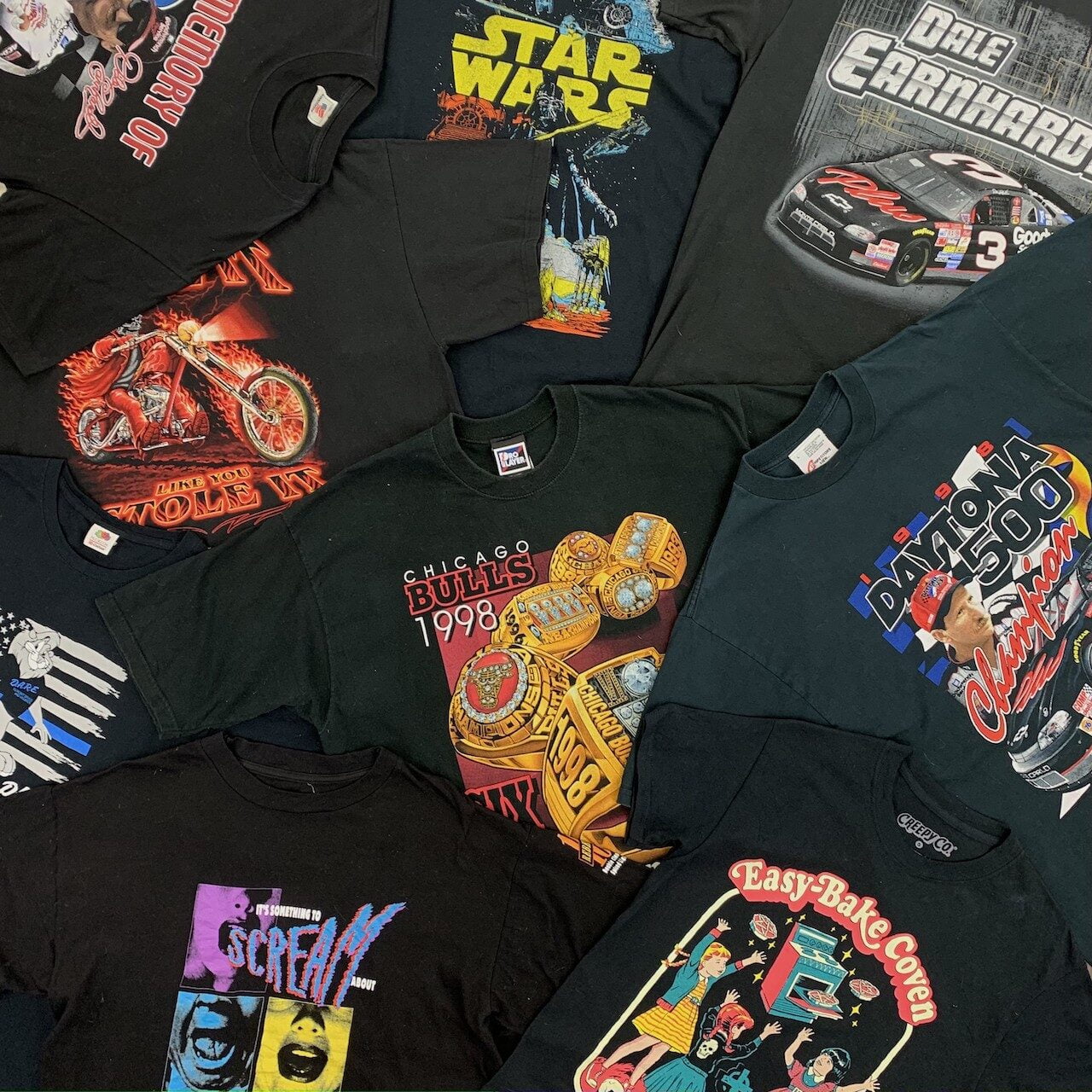 Získejte přístup k Černým Vintage Graphic Tričkům v různýchvelikostech.